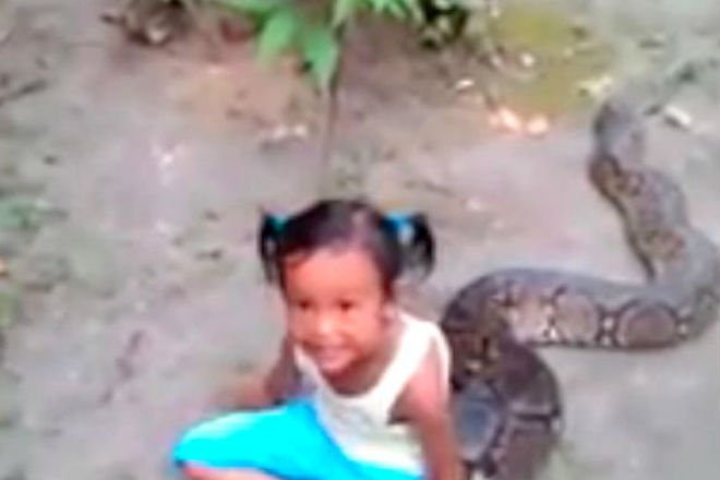Ролик снят где-то в индонезийской глубинке. По двору мирно, будто так и надо, проползает колоссальный сетчатый питон. Маленькая девочка даже не раздумывая забирается на него верхом и какое-то время едет.