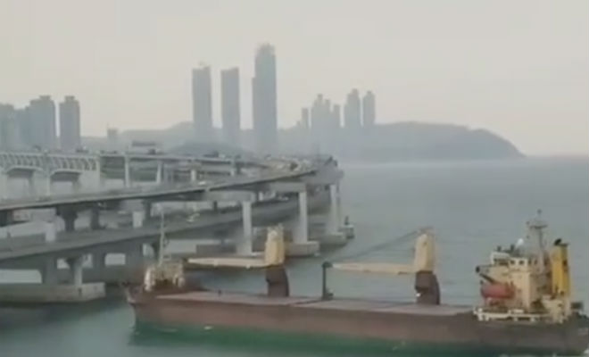 Упрямый капитан российского сухогруза решил взять пример с газелистов, которые вечно пытаются протиснуться под низкими мостами. Для своего маневра он выбрал морской переход автомобильной развязки в Южной Корее, которая была явно меньше огромного сухогруза. Но для настоящего морского волка высота развязки не показалась проблемой, и он решился на маневр.