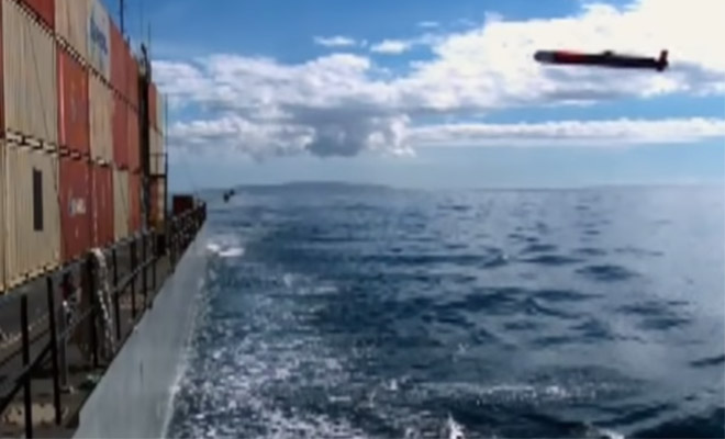 Несколько секунд и ракета достигает своей цели. Поскольку маневры были учебными, с ракеты сняли боевую часть – в момент отработки цели ракета просто пробила один из контейнеров на судне. Впечатляющая точность!