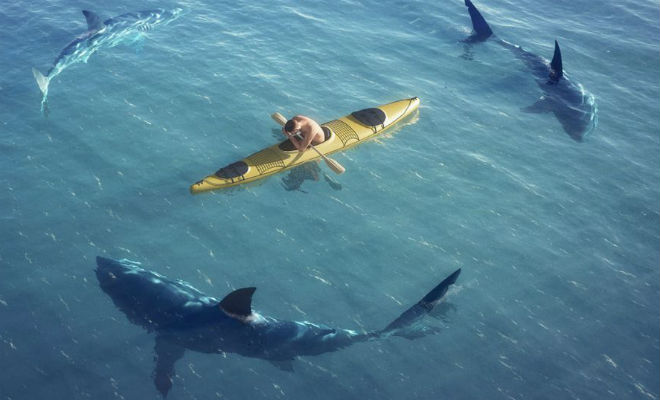 Но стоило ему комфортно расположиться у борта лодки, как из воды показались два хищника. Океанские охотники кружили рядом, явно не довольные друг другом.