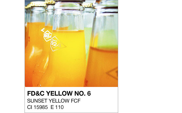 Название этой краски передает тона очень четко: Sunset Yellow – красновато-желтая краска, полученная из битума. Она запрещена в Норвегии и Финляндии, включена в список добровольного отказа в Великобритании. Найти этот краситель можно в апельсиновой содовой, горячем шоколаде, готовых завтраках и леденцах.