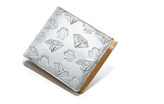 Кошельки, ремни, кепки исполнены в металлической цветовой гамме и украшены клеймом в виде ограненного бриллианта и стилизованного знака американской валюты.