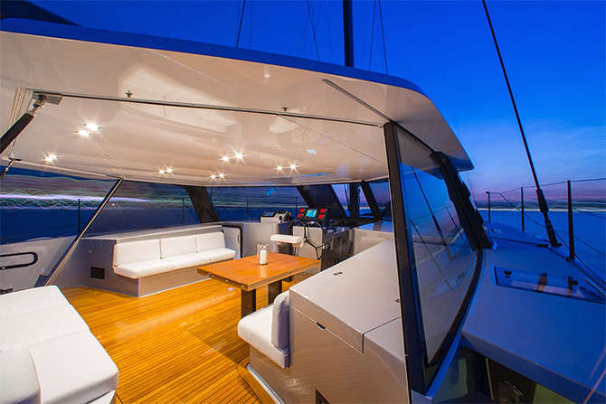 Само собой, отличающийся приверженностью к еще никем не опробованным решениям, мастер Коэн не упустил случая модернизировать стандартное, в общем-то, оснащение двукорпусного судна. Отрицательный форштевень, полностью застекленная рубка и гармония сливающихся на носу в точку палубных скатов может свести с ума любого перфекциониста — от радости, конечно же.