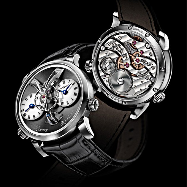 Флагманская модель новой коллекции Legacy Machine с колеблющимся балансом, расположенным над двумя циферблатами.