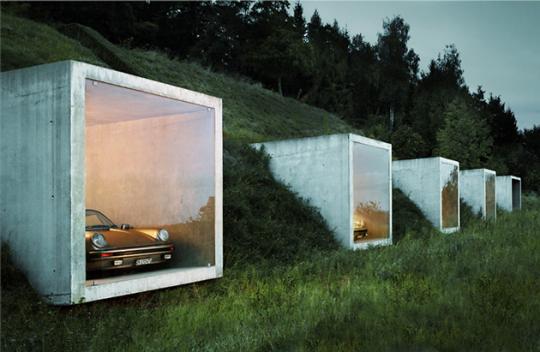 Гараж, спроектированный архитекторами студии Peter Kunz Architektur в городе Хердерн в Швейцарии, сделан по принципу автомобильного салона: снаружи через панорамное стекло можно обозреть каждую из пяти припаркованных там машин. Найти парковку можно только зная о ее существовании: бетонная структура вписана в холм так, что снаружи видны только 5 окон-витрин и въезд.