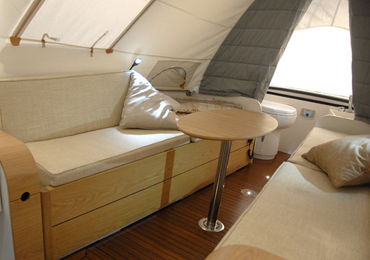 Палатка перевозится как прицеп, а потом легко снимается с колес и переводится в горизонтальное положение за нескольких минут. Среди удобств Opera можно перечислить кухню с горячей водой из бойлера и холодильником, душ, резервуар с запасом воды и помпой, отопление и освещение с помощью энергосберегающих электродиодов. Комфорт и уют палатки дополняют веранда из тикового дерева, две кровати, складывающиеся при желании в одну, керамический санузел, два шкафа и бар.