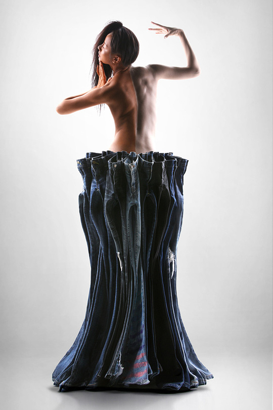 Дизайнер Джефр Вонг (Jeffrey Wang) дал волю фантазии в недавнем проекте Persona. Полуобнаженные манекенщицы продемонстрировали необычные джинсовые наряды. Все вещи были сделаны из стандартной одежды фирмы Levi's. Никаких швов или клея, джинсы крепятся друг к другу с помощью булавок. Гармоничное сочетание формы и идеи вот, что хотел донести мастер современного искусства.