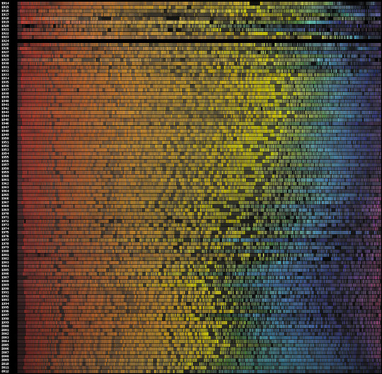 Это касается и одежды, и интерьеров, и афиш кинофильмов. Блогер Вижай Пандуранган решил посмотреть, как именно изменилась мода на цвет киноафишах за прошедшие 100 лет. Он собрал 37000 постеров с 1914 по 2012 год и составил на основе их анализа инфографику. Как видно из созданного им графика, с каждым годом наши афишы становятся все более синими, даже если мы этого не замечаем.