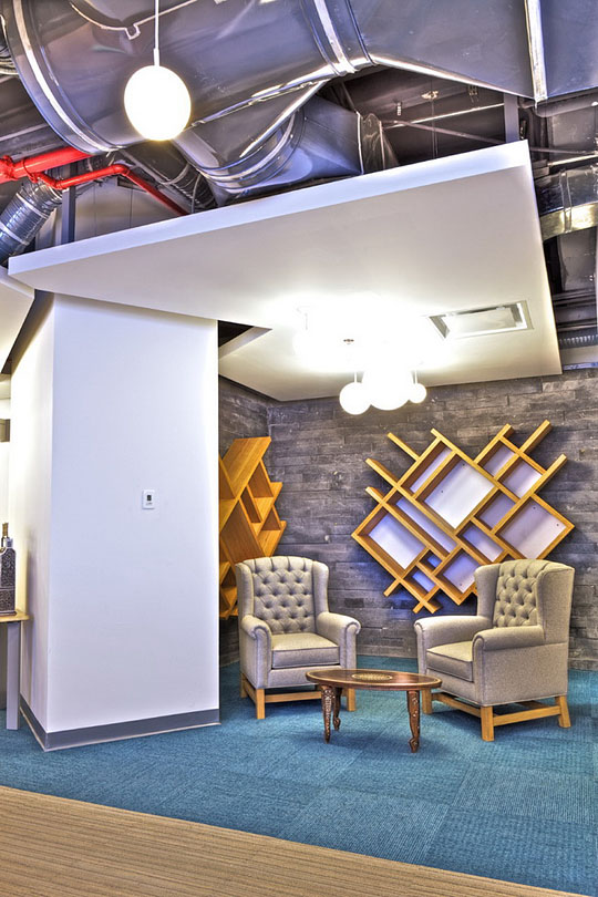 Красочный стиль выдержан во всех зонах офиса: от входной группы до мест отдыха. Солнце, небо и растения интегрировали в офисное пространство в виде составляющих интерьера, элементов декора и предметов мебели. Изменив высоту потолков и интенсивность освещения, офис разбили на зоны. Рабочую область расположили так, что естественный свет попадает на каждое место.