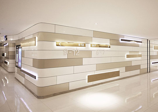 Отсылка к истории кинематографа в декорации холлов — единственный «ретро» элемент в кинотеатре. Все остальное архитекторы сделали подчеркнуто современным. Огромный белый холл с изгибающимися стенами напоминает внутренности космического корабля. Зрительные залы по контрасту оформлены в темных тонах со вставками оранжевого и розового.