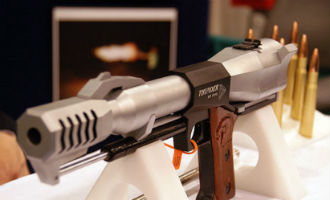 Трудно назвать это бронебойное чудовище пистолетом. Конструкторы фирмы Triple Action LCC задались целью выпустить мечту каждого американца и почти преуспели. Однозарядный Thunder 50 BMG использует боеприпас крупнокалиберной снайперской винтовки. Совершенно неясно, как и в кого из этого кошмара палить: во время выстрела из компенсатора пламя бьет на пять метров, а отдача легко может сломать стрелку руку.