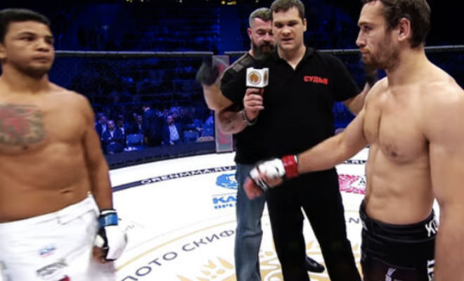 Он нарочито проигнорировал протянутую руку Алексея, всем своим видом показав, что не уважает соперника. Первые раунды бразилец доминировал и даже сумел забрать спину Кунченко.
