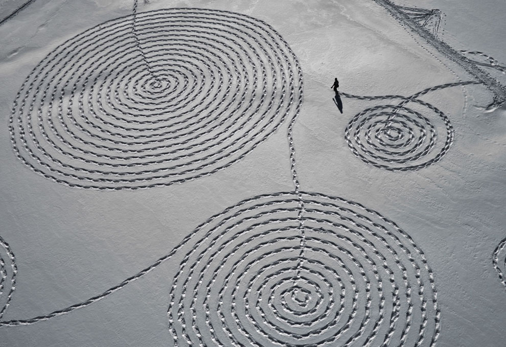 Обычный снег тоже может стать арт-объектом. Более того, его можно использовать в роли холста. Это доказали художники Соня Хинриксен и Симон Бэк. С помощью специальных ботинок и нескольких помощников они создают сложные узоры и фигуры на заснеженных склонах гор.