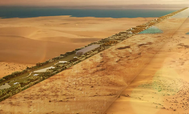 The Line, самая амбициозная часть проекта NEOM и его основа, представляет собой самоустойчивый линейный мегаполис, протянувшийся на 120 километров от Красного моря к городу Табук на востоке.