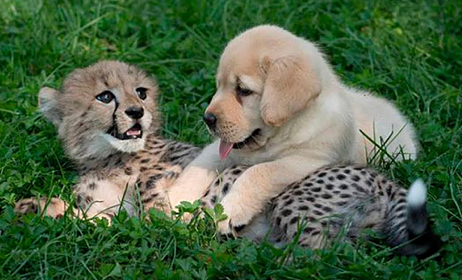 Котенок гепарда впал в депрессию и отказывался от еды. Тогда к нему запустили щенка