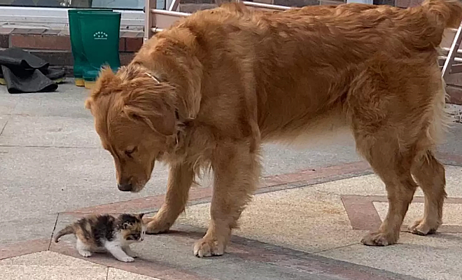 Собаки заметили на улице брошенного котенка и настояли, чтобы хозяин взял его домой
