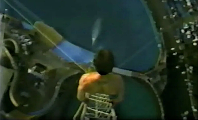 Тем не менее, Рик настоял на своём. Для прыжка был выбран бассейн в калифорнийском океанариуме — небольшая по размерам цель, требующая невероятной точности. В момент прыжка камера выхватила лицо его спутницы, которая с тревогой и напряжением наблюдала за происходящим, не скрывая волнения и опасений за его жизнь.