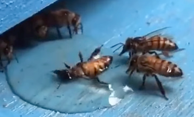 На видеозаписи с камеры наблюдения, установленной возле улья, пасечник случайно зафиксировал трогательную сцену спасения пчелы, оказавшейся в беде. Насекомое случайно упало в небольшую лужу воды и оказалось спиной вниз. Из-за поверхностного натяжения жидкости крылья прилипли к воде, и пчела не могла взлететь самостоятельно.