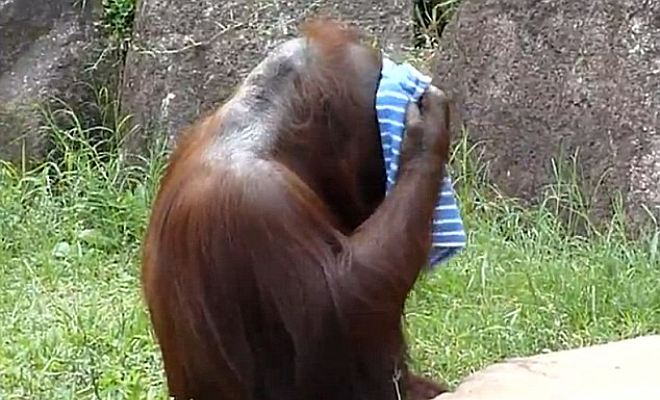 Орангутанг заметил как люди спасаются от жары и научился пользоваться полотенцем