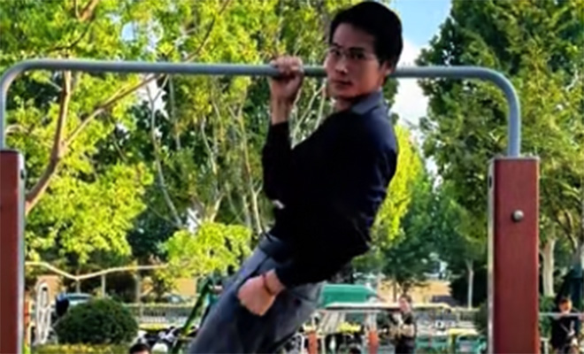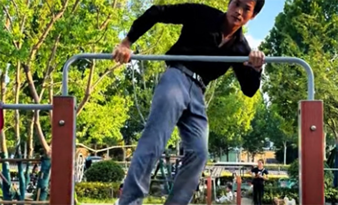 Кореец подошел к турнику и начал делать трюки, словно на него не действуют законы физики