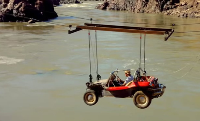 На кадрах, снятых очевидцами, видно, как многотонная машина подвешена к тросам и медленно движется над бурной рекой. Скорее всего, пассажирам хватило ума выйти и подождать. С другой стороны, им в любом случае придется перебираться на другой конец пропасти.