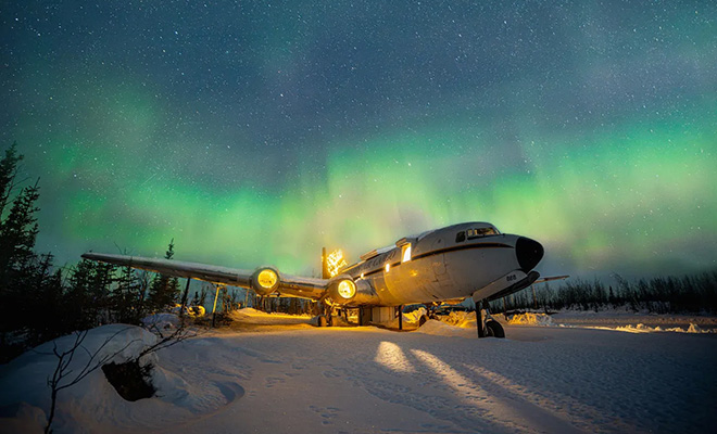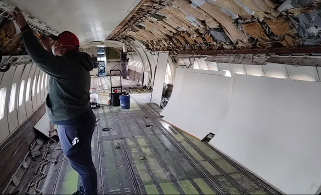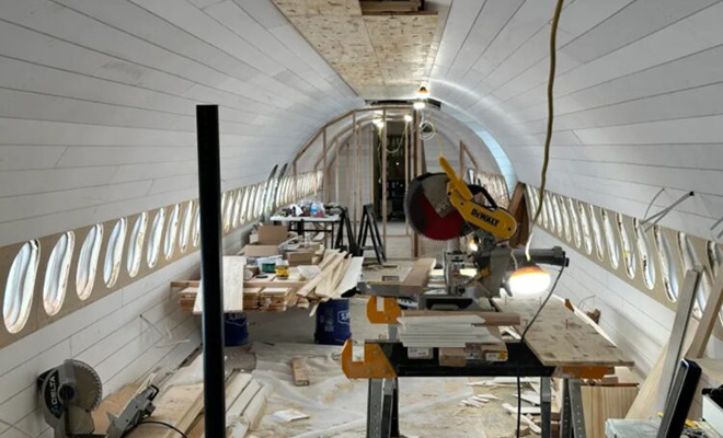 На переделку DC-6 в жилье ушло целое аляскинское лето. С двадцатью рабочими Котвицки выходил на площадку к восьми утра и заканчивал ближе к полуночи, стараясь сохранить в интерьере дух самолета и одновременно сделать его комфортным домом. Снаружи борт по-прежнему выглядит как старый грузовой лайнер, стоящий посреди частного участка с тропами для летних прогулок и зимнего лыжного кросса. Гости заходят через грузовую дверь, а на крыле появился открытый деревянный настил для ужинов под северным небом.
