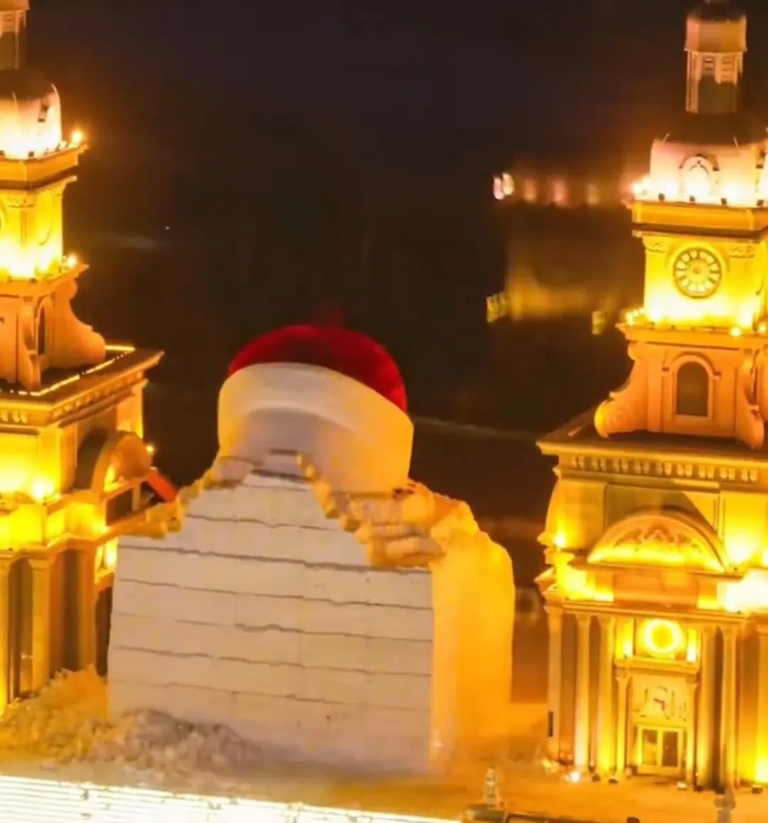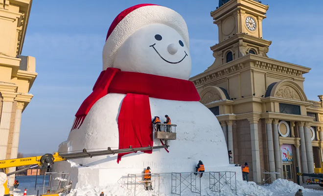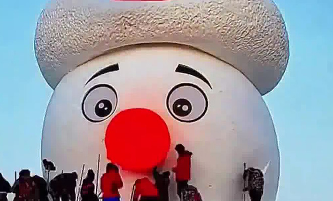 В Китае выстроили снеговика высотой с 5-этажный дом. Процесс засняли на видео