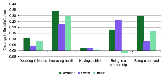 Работа особенно важна для немцев и заметно влияет на британцев, а у швейцарцев этот фактор слабее. Партнерство сильнее всего поднимает швейцарцев, поддерживает немцев и почти не работает в плюс у британцев. Друзья добавляют немного, дети почти не двигают шкалу.