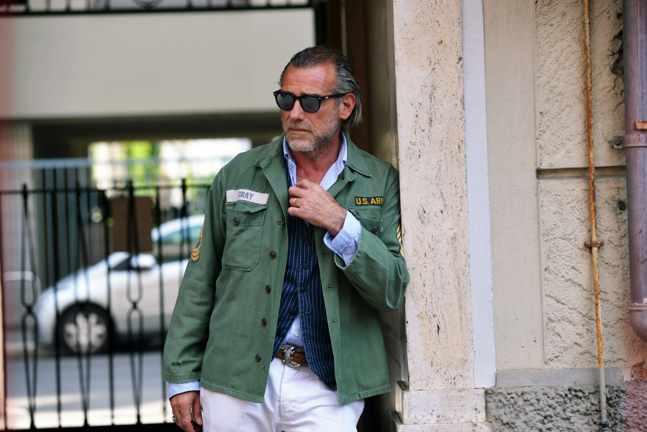 Зеленый цвет характерного милитари-оттенка — самый узнаваемый цвет в истории мужской моды. С самого появления в середине двадцатого века, глубокие оттенки зеленого оставались самыми успешными цветовыми решениями. Точно так же как современная мода почти целиком выросла из военной одежды, это цвет стал основой гардероба мужчины.